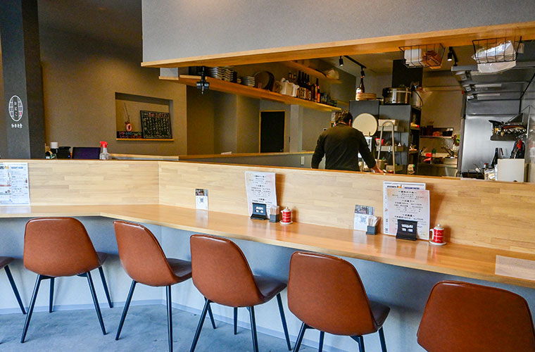 店内はグレーを基調にしたシックでスタイリッシュな空間。クラシックなスツールがアクセントとなり、厨房を囲むようにカウンター席とテーブル席を配置しています。キッチンから漂う香りや調理の音が心地よく、五感で食事を楽しめるのも魅力です。