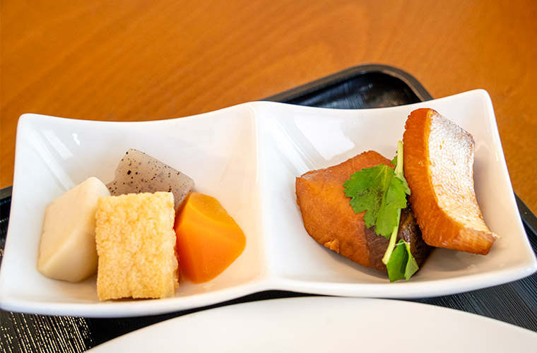 さらに添えられる2種類の小鉢も、このランチの楽しみの一つ。この日は野菜の炊き合わせとブリの煮付けが並び、どちらも素材の持ち味を引き立てた家庭的な味付け。季節ごとに内容が変わるため、訪れるたびに新しい発見があります。