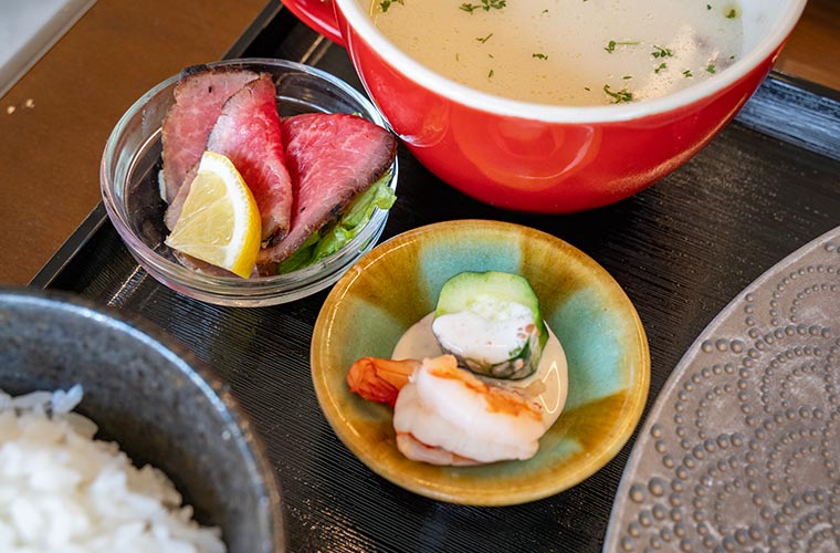 こちらのランチには季節の一品に加え、「国産ローストビーフ」も味わえ、お得感が満載です。