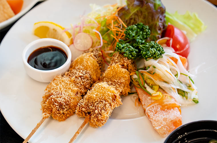 『日替わりランチ』も見逃せません。メインは定期的に変わり、その時々の旬や仕入れに合わせた味わいに出合えるのが魅力です。取材時は「串カツ」と「サーモンの南蛮漬」が提供されていました。