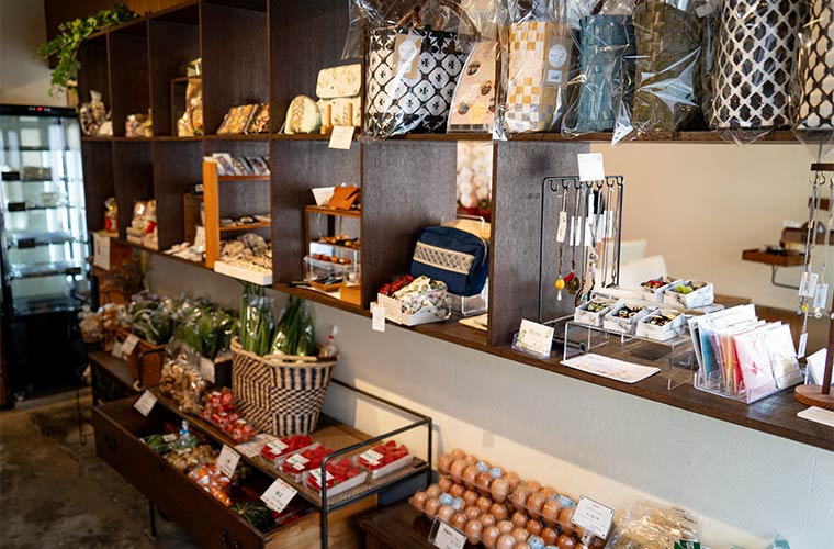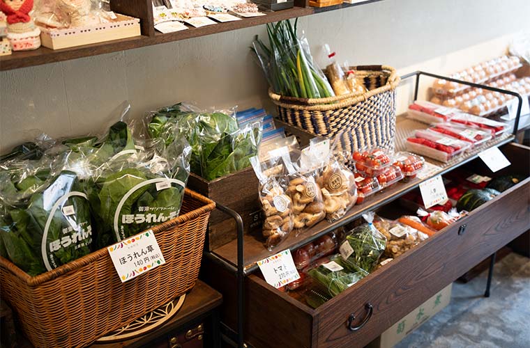 食事を楽しんだあとは、ぜひ物販エリアにも立ち寄ってみて。並ぶのは、店内で丁寧に仕込まれた惣菜をはじめ、地域で採れたみずみずしい野菜や、日々の食卓に寄り添う醤油などの調味料。どれも作り手の顔が浮かぶような、温かみのある品ばかりです。