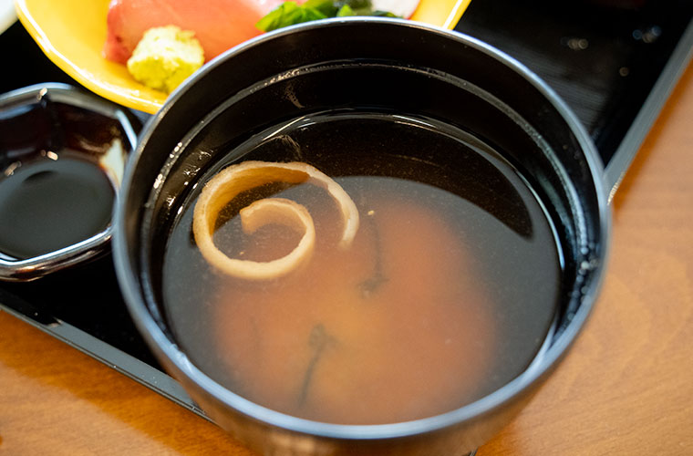 2種類のみそをオリジナルでブレンドしたみそ汁は、ほっと心ほどける優しい味わい。飲み進めるほどに、じんわりと満たされていく一杯です。