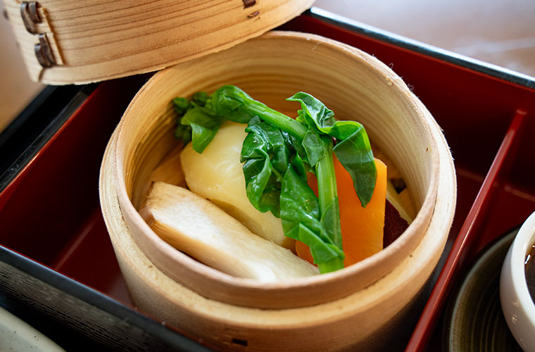 中でも印象的なのが、野菜のせいろ蒸し。コクを感じる特製ゴマたれと、独自にブレンドされた塩でいただきます。まずはぜひ、シンプルに塩で一口味わって。野菜本来の甘みや香りがぐっと引き立ち、そのままのおいしさをまっすぐに感じられます。