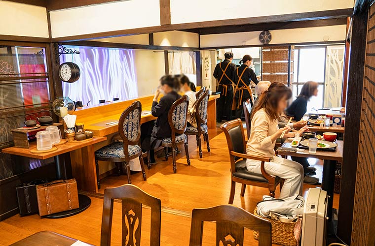 内装は、古い建物の趣を残しながら、畳の空間をフローリングへと改装。だれもが気軽に立ち寄れるような空間に仕上げられています。キッチンも以前より広く設計し直し、揚げ物をはじめとした幅広い調理に対応。オープンキッチンならではのライブ感があり、客席からは料理が仕上がっていく様子を目でも楽しめます。
