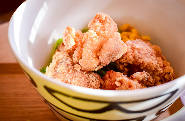 取材日に選んだのは、一番人気の「若鶏の唐揚げ」。しょう油をベースに、ニンニクやリンゴを加えた自家製ダレに一晩じっくりと漬け込み、下味をしっかり付けしているそう。中まで味が染み込んだ深いうま味が楽しめます。二度揚げすることで、衣はサクサク、中からは肉汁がじゅわりとあふれるジューシーな仕上がりに。大きめの唐揚げが5つも入っていますが、女性でもぺろりと食べられる軽やかなおいしさです。