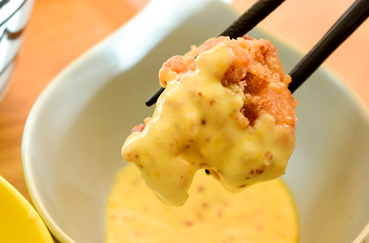 ソースは、甘辛マヨや果実の大根おろしソース、ハニーマスタードなど全7種類。この中から2種類を選べるので、味変しながら楽しめます♪