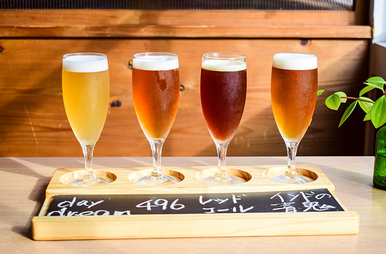 いろいろな味を楽しみたい人には、フレーバーの違いが楽しめる『4種類飲み比べセット』もおすすめです。この日は、山椒の香りが特長の「Daydream」をはじめ、「豊潤ラガー496」「レッドエール」「インドの青鬼」など、個性豊かなクラフトビールが登場。色や味わい、香りの変化を感じながら、じっくり味わってみて。