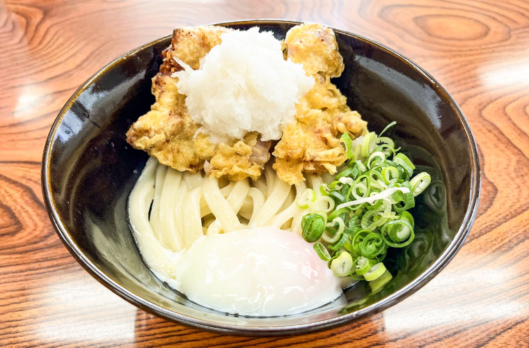 同店の看板メニュー『温泉たまごのとり天おろし釜たま』は、もちっとした中太麺に温泉卵と大根おろしがなめらかに絡む、まろやか&爽やかな味わい。さらに、ジューシーなとり天のサクッとした食感が絶妙なアクセント。讃岐本場のコシを感じるうどんと組み合わさり、満足感たっぷりの一品。リピーターが多い理由も納得の人気メニューです。