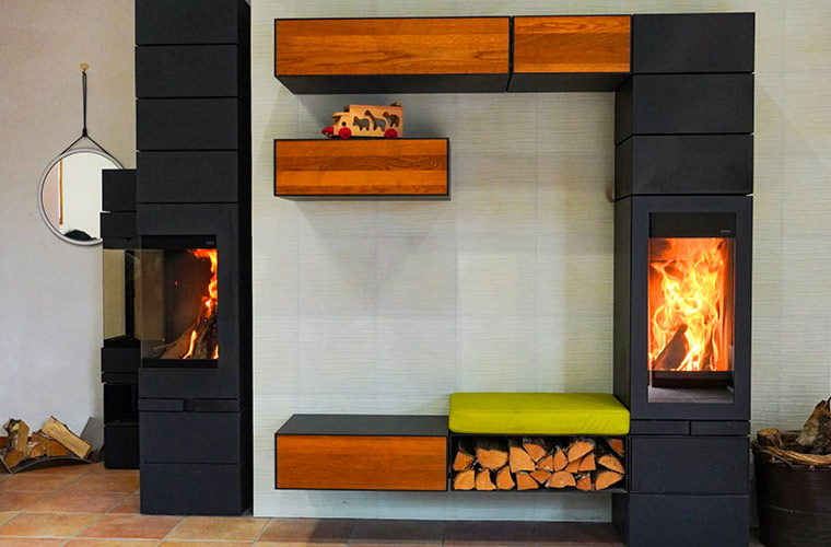 ラインアップも豊富で、ソファと一体化したデザインのものや、薪の収納スペースを備えた実用性の高いタイプもあり、インテリアの一部として楽しめるのも特徴。また、煙突の設置方法も柔軟で、従来のように屋根の上から出すタイプのほか、壁に埋め込んだり、背面から外に出すなど、外観を損なわない設計も可能です。