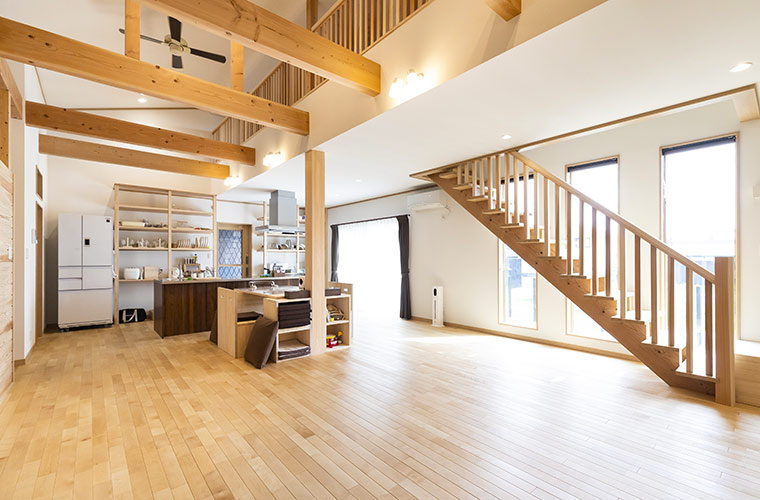 外観はスタイリッシュでモダンながら、屋内には木の香りが漂う「木の家」が「小田製材所」のスタンダード。床や柱、見せ梁(ばり)など随所に木を取り入れた、心地よく癒やされる空間が広がります。さらに、光の入り方をシミュレーションして設計されているため、開放感あふれる明るい室内も魅力です。