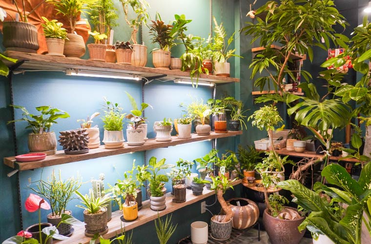 移転によって広くなった店内には、生き生きと葉を伸ばす室内用の観葉植物がずらりと並びます。ここに並ぶ植物はすべて、店主が目利きしたもの。時には鹿児島県や沖縄県といった産地にまで足を運び、生産者のもとを訪れて買い付けることもあるそう。