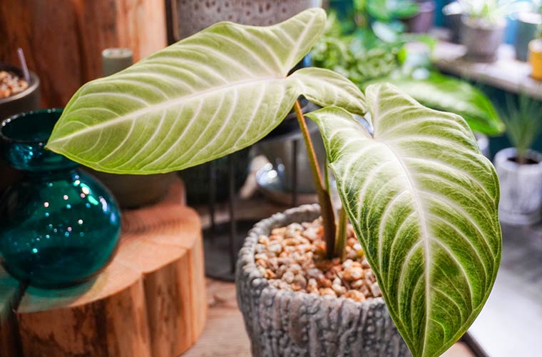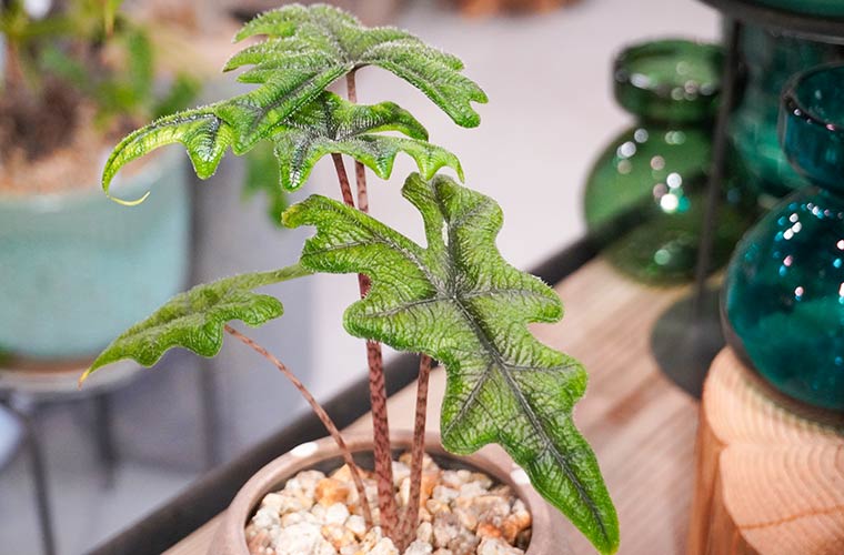 ハート形の大きな葉を持つ「キサントソーマ」は、熱帯地方に生息する植物。成長すると1枚の葉に新芽がつくため、適度に剪定してあげるのが長く楽しむコツだそう。パッと空間が明るくなるような、くっきりとした白い葉脈が特徴で、インテリアのアクセントにもぴったりです。