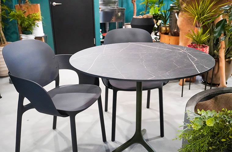 中でもおすすめは、大理石風のデザインでありながら軽量で汚れにくい素材を使用したテーブルとチェア。カラーは3色展開されているので、気軽に店主に相談してみて。