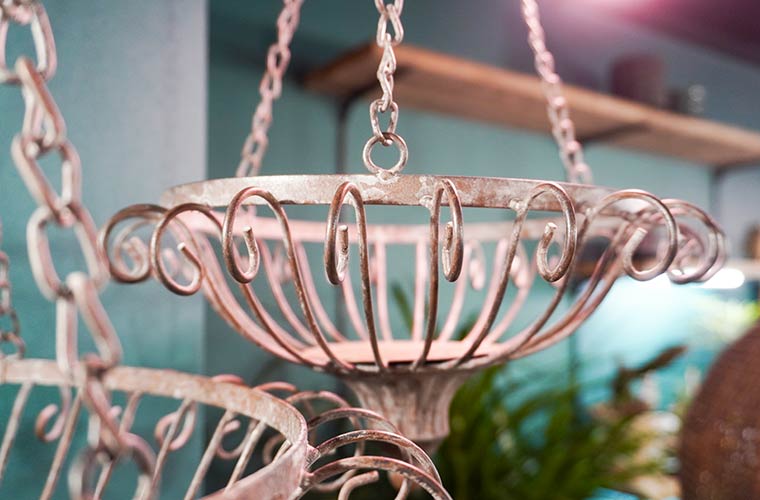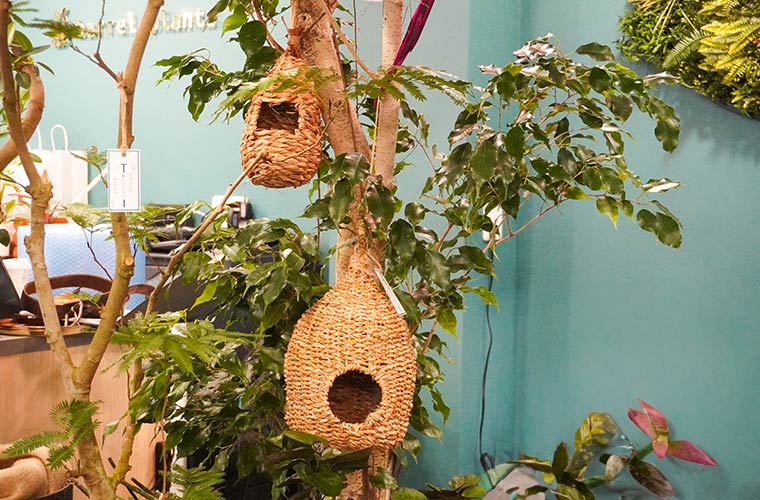 アンティークな風合いと色合いがかわいらしい『バンキングオブジェ』など、天井にもインテリアアイテムが展示販売されています。何も入れずに吊るしているだけでももちろん、ドライフラワーやグリーンを入れて飾ることで、空間全体がぐっと華やかな印象に。視線を上に向けることで、インテリアコーディネートの幅も広がりそうです。