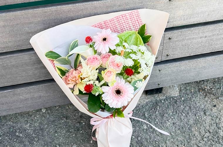 母の日や誕生日、卒業式など、季節の節目を彩る贈り物として、好みの生花を組み合わせて仕上げる花束やフラワーアレンジメントが人気です。アレンジメントは3,000円~で、予算やイメージに応じて、その場で一つひとつ丁寧に作ってもらえます。