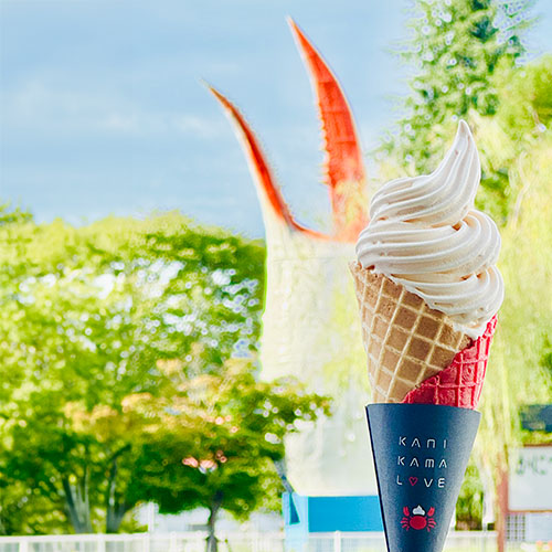 芝桜を鑑賞した後は、練り製品などを販売するかまぼこ工房「夢鮮館(ゆめせんかん)」で腹ごしらえを。敷地内にある「ちくわ工房」では、焼き立てのちくわや、ご当地『かにかまソフト』を販売しています。