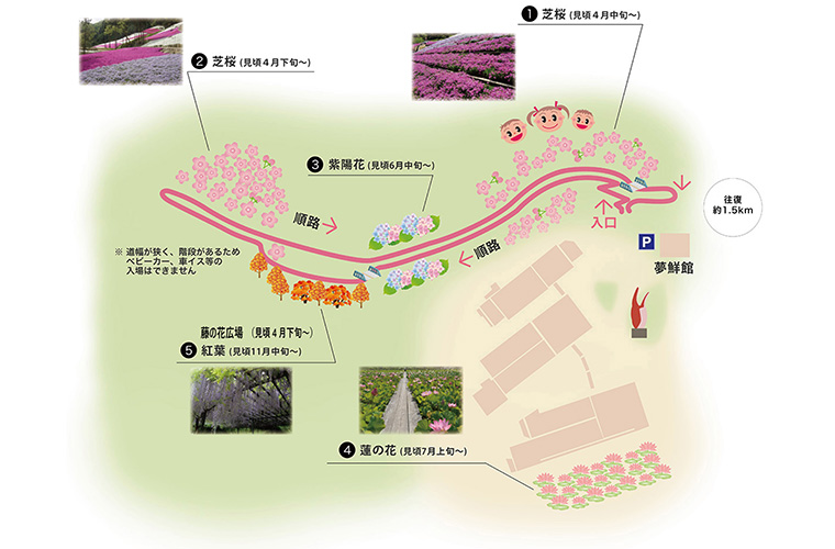 往復約1.5kmの順路沿いでは、芝桜をはじめ、5月ごろに見ごろを迎えるアジサイや、7月上旬ごろに花を咲かせるハス、さらに秋には紅葉も楽しめ、一年を通してさまざまな景色を楽しむことができます。➡︎マップはこちら(PDF)