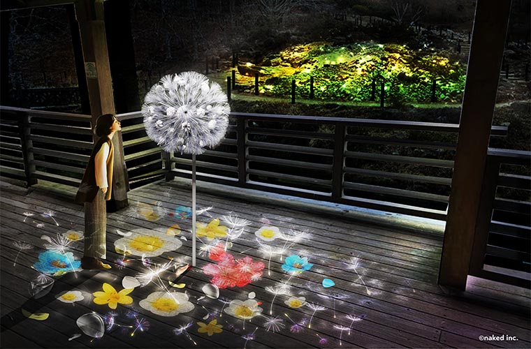 期間中の土日祝は、「ひかりの森〜夜の芸術散歩〜」を開催。園内に展示されたアート作品のライトアップが行われます。今年初出展のアーティスト村松亮太郎氏/NAKED,INC.による、参加型アート作品も登場!