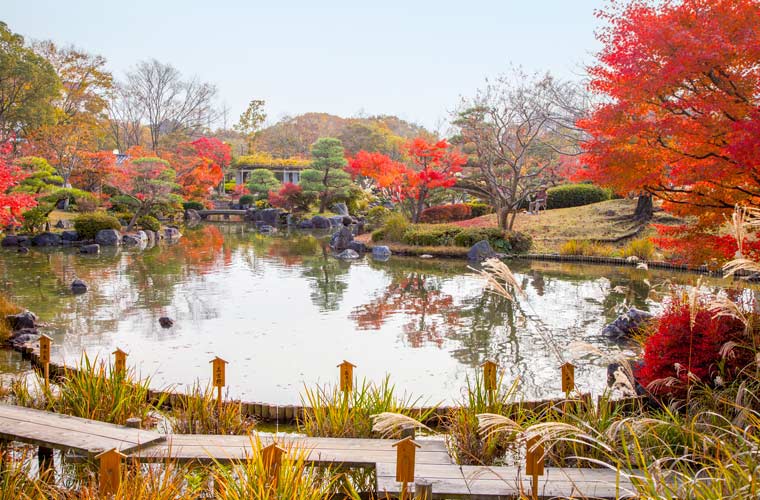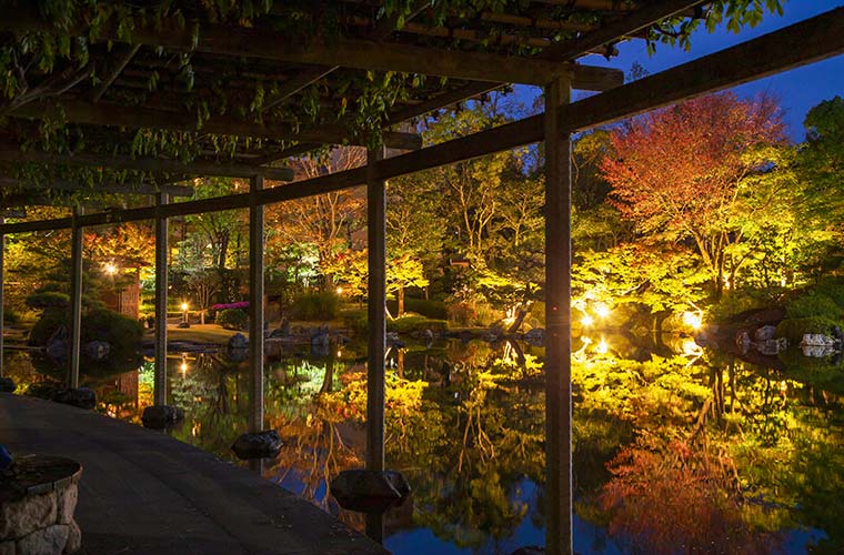 中でも、「日本庭園」がおすすめスポットで、紅葉シーズン真っ盛りの11月上旬〜下旬にかけては、期間限定でライトアップの開催も。美しく彩られたモミジや菊などが足元から色とりどりに照らされ、水辺に映る逆さ紅葉がなんとも幻想的。昼から一変、ならではの風情が感じられる、ちょっぴり大人なムードの紅葉を堪能してみては。