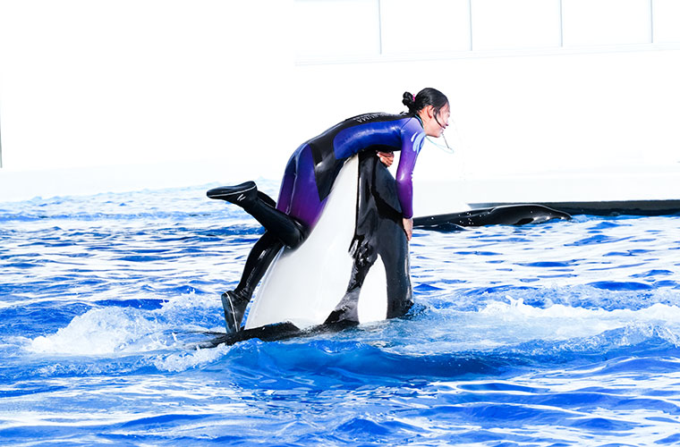 迫力満点のパフォーマンスを楽しむのも醍醐味ですが、もう一つ注目してほしいのが、トレーナーのアクロバティック。シャチの口先に立ったり、シャチと一緒に高くジャンプしたり…。一つひとつの技が終わると、仲睦まじい姿が見られ、キュンとすること間違いなし。シャチとの絆の深さに、感動させられるはずですよ。