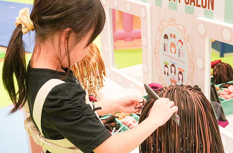 おしゃれ好きの女子に人気の「美容室ブース」では、太めの紐でできた人形の髪の毛をクシでといたり、ゴムで結んだりと、思い思いのヘアアレンジを楽しむことができます。ブース内にはドライヤーやストレートアイロンなど、まるで本物の美容室のようなアイテムがずらり。自分の手で仕上げたウィッグは、実際にかぶってみることもできるので、子どもたちはまるでスタイリストになった気分に♪
