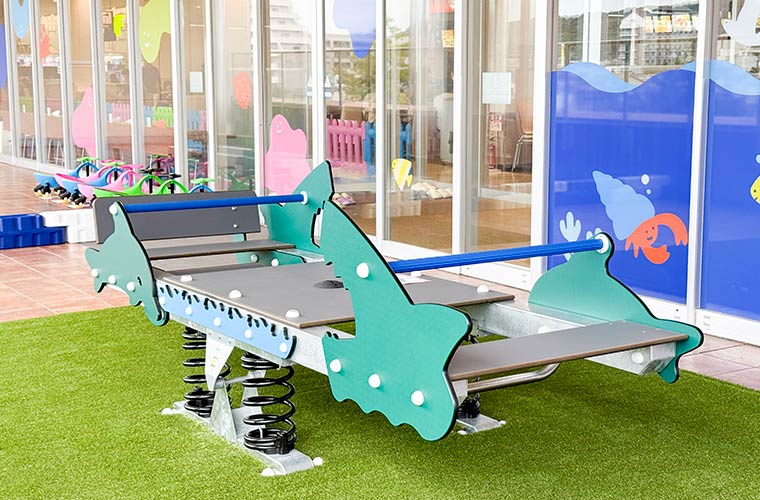最大6人まで乗ることができる大型シーソーは、年齢や発達の度合いに関係なく、だれもが一緒に楽しめるインクルーシブ遊具です。姿勢の保持が難しい子どもでも安心して利用できる設計。体重差で上下する従来のシーソーとは異なり、お互いに跳ねるように揺らしながら遊ぶユニークな仕組み。みんなで息を合わせて動かしてみて♪