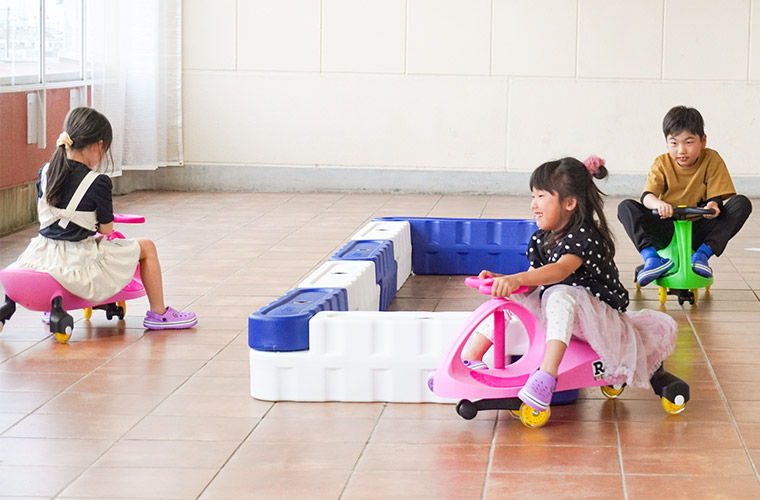 テラスに出て右手にあるのが「サーキットコーナー」。ここには小型の三輪車が用意されていて、子どもから大人まで年齢を問わずレースに没頭することができます。ハンドル操作とバランス感覚が問われるため、意外と大人のほうが苦戦することも。たまには大人ということを忘れて、我が子と一緒に本気になって競争してみては?