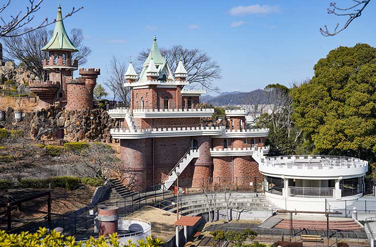 手柄山平和公園内にある「ロックガーデン」は、岩や石組みを生かした立体的な景観が楽しめるスポット。緑に囲まれた園内には、存在感のあるスリラー塔がそびえ立ち、まるで中世ヨーロッパのお城に迷い込んだかのような気分を味わえます。