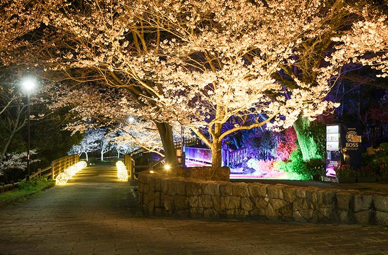 さらに、例年3月下旬~4月上旬の間に10日間連続で開催されるイベント「敦盛桜」では、夜桜のライトアップも実施。ランタンやプロジェクションマッピング、多色ライトで彩られた幻想的な桜が、春の夜を美しく演出します。