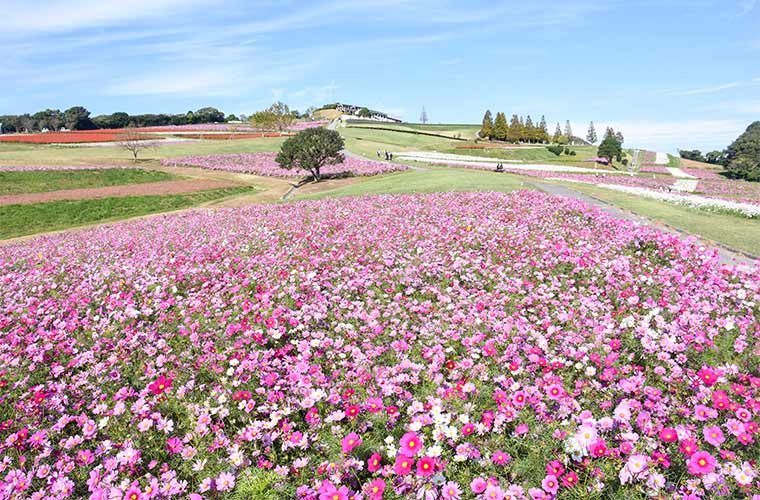 神戸市須磨区にある「神戸総合運動公園」は、野球場や競技場などのスポーツ施設、子どもが思いっきり遊ぶことのできる大型遊具やアスレチックなどがある広大な公園。秋になると小高い丘一面に約10万本のコスモスが盛大に咲き並びます。丘から見下ろすコスモスの群生は圧巻ですよ。