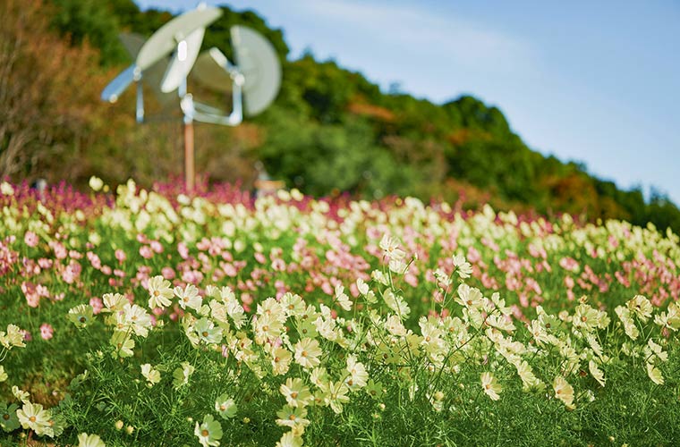 園内の「風の丘フラワー園」や「四季の庭」では、10月上旬から、ピンクや黄色などのコスモスが見ごろを迎えます。中でも「風の丘フラワー園」は神戸の景色を一望できる絶好のロケーション。昼、夕と表情を変えるコスモスも素敵です。園内にはハンモックやベンチなどの休憩スポットが備えられているので、ピクニックに訪れてみるのもいいですね。