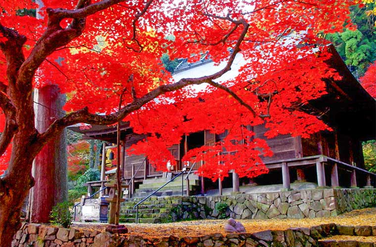 山門前を赤く彩るモミジが参拝者を出迎えてくれます。修験道の寺院として毎年10月に行われる採燈大護摩(さいとうだいごま)が有名。国の重要文化財に指定されている金堂や多宝塔、毘沙門天(びしゃもんてん)立像など、紅葉と合わせて見学したい文化財も数多くあります。