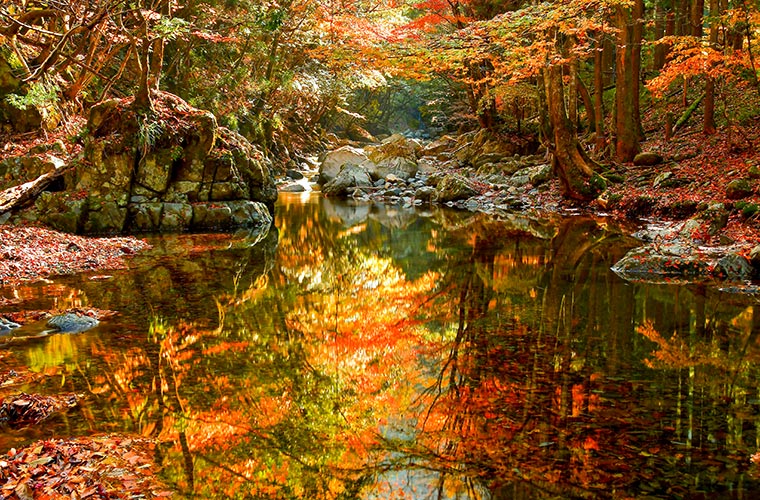 四季折々の渓流美を見せ、「関西の風景100選」「ひょうご風景100選」に選ばれている福知渓谷。毎年10月下旬から見ごろを迎え、赤や黄色に彩られた渓谷沿いを歩きながら紅葉が満喫できます。