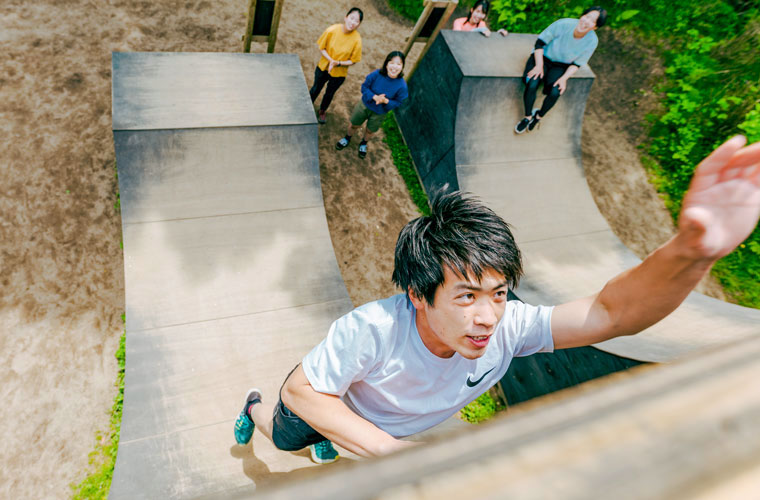 まずは陸上系のアスレチックから攻めるのが鉄板。「フィッシャーズ」監修のバラエティーアスレチック「yahhoy(ヤッホイ)」は、小さな子どもから大人まで楽しめるエリアです。走ったり登ったり、バラエティーと難易度に富んだアクティビティが中心。筋力自慢の男性は、3.6mと2.6mの大小2つの壁をよじ登る「no.17 そりたつカベのてっぺんで」に挑戦してみて。