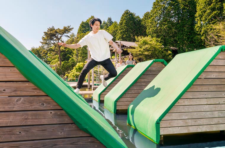 森の中のフィールドアスレチック「wonder yamembo(ワンダーヤマンボー)」は、「フィッシャーズ」が監修。陸上系と水上系アスレチックが同時に楽しめます。ロープを引っ張ってイカダを動かし、岸から岸へ移動します。小学生未満の子どもは大人と乗れるので、親子で協力プレイを。