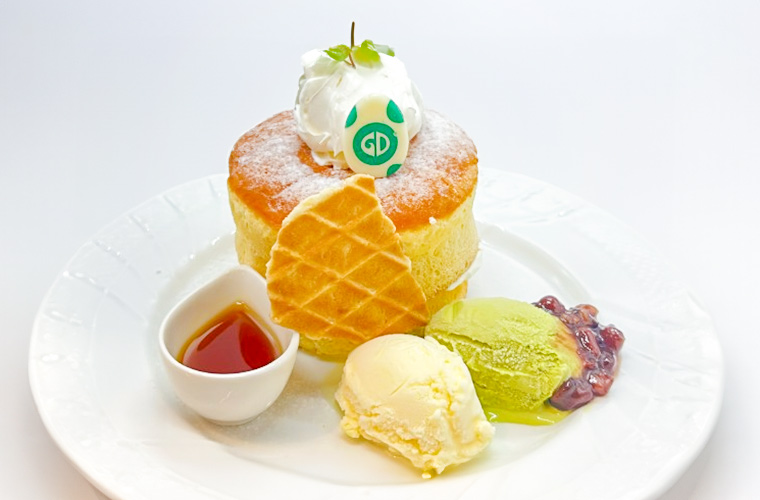 「GREENIA」の王様がおやつに食べていると言われているスフレパンケーキ 。分厚いふわふわのスフレパンケーキと抹茶とバニラのアイスクリームがトッピングされた一品です。