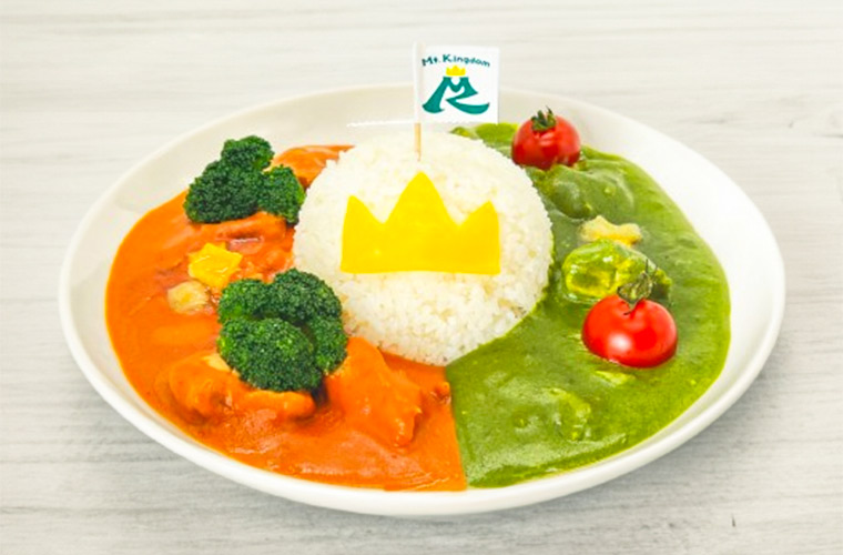 新アスレチックエリア「Mt.Kingdom」のオープンを記念して、オリジナルフードが登場!王冠マークのチーズが添えられたトマトとほうれん草を使用した秘伝の2種盛りカレー。