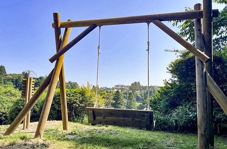 小学生以下の小さな子どもから楽しめるスポットも。「yahhoyエリア」の中にある「yahhoy kids(ヤッホイキッズ)」には、ブランコやボルダリング、丸太渡りなどの木でできた遊具がたくさんあります。