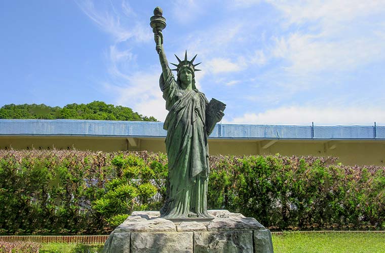 かの有名な「自由の女神」も忠実に再現。その堂々とした姿は、思わず写真に収めたくなる存在感です。さらにすぐ隣には小便小僧がずらりと並び、なんともユニークな世界が広がります。名所と名物が思いがけない形で共演する、ここならではの光景があります。