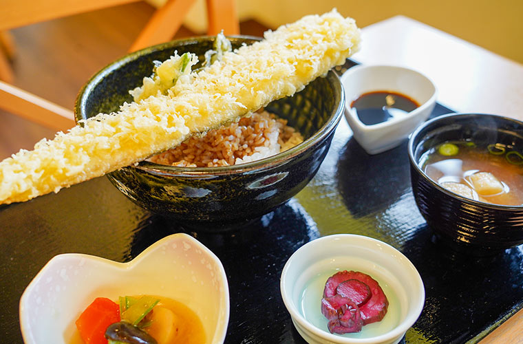 2階のレストラン「レストランスワン」では、カレーやラーメン、うどんなどの定番メニューに加え、地元の特産品を使った料理も味わえます。中でもおすすめは、器からはみ出すほど大きな穴子を丸ごと1本天ぷらにした『あなご天丼御膳』。揚げたてサクサクの衣に包まれた穴子は、身がふんわりとしてあっさりとした味わい。甘めのタレがごはんと絶妙に絡み、箸が止まらなくなるおいしさです。