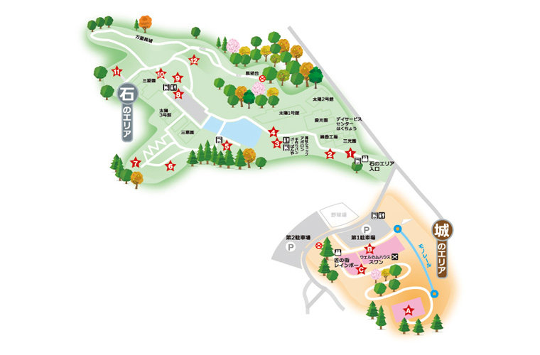 園内は、「凱旋門(がいせんもん)」をはじめとする石の文化遺産が集まる「石のエリア」と、山頂にそびえる「白鳥城」を見学できる「城のエリア」の2つに分かれています。チケットは、第一駐車場すぐの「ウェルカムハウス スワン」または「石のエリア」入口で購入可能。どちらの窓口でも、両エリア共通のチケットを販売しています。
