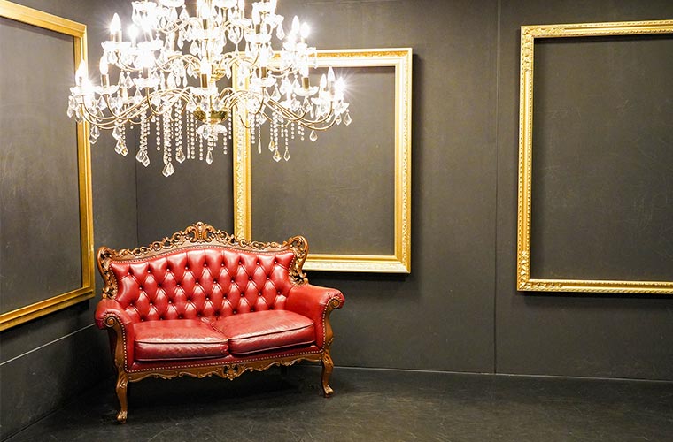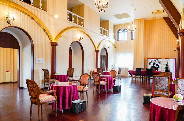 6階にある「王座の間」も、人気のフォトスポット。ゴージャスなシャンデリアがきらめき、アンティーク調のソファや重厚感あふれるインテリアが並ぶ空間は、まるで中世ヨーロッパの宮殿の一室のよう。中世風の衣装で写真を撮れば、より一層雰囲気が高まり、特別な一枚が残せるはずです。