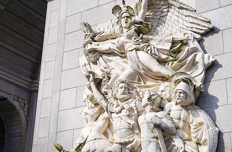 門の四面に施された彫刻は、戦いや勝利の情景を表現した芸術性の高い装飾で、細部に至るまで丁寧に再現されていて、見応え満点!