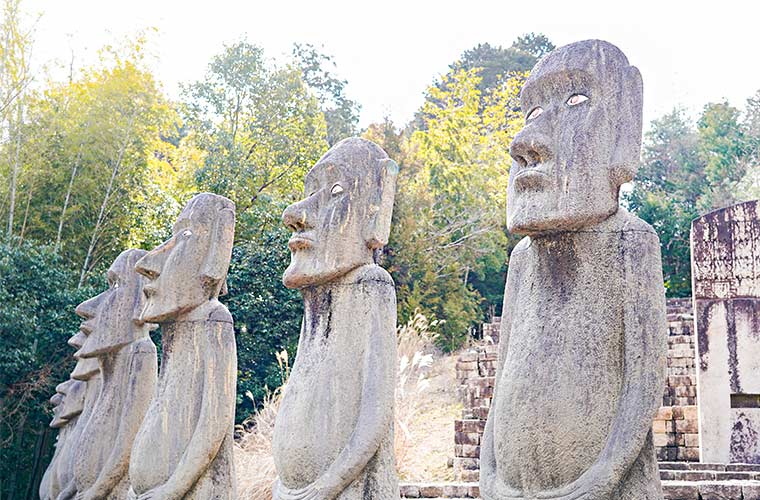 さらに奥へ進むと、突然現れるのはイースター島のモアイ像。よく見ると目が描かれており、いっそうリアルで存在感のある表情に。静かにたたずむ姿からは、どこか神秘的な空気が漂い、しばし見入ってしまいます。