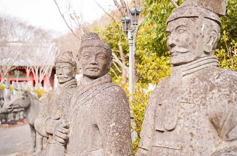 順路に沿って進むと、道の両側にはさまざまな石造が並びます。一見どれも同じように見えますが、よく目を凝らすと、表情や佇まいが少しずつ異なることに気付くはず。凛としたもの、どこか優しいもの、思わず微笑んでいるように見えるものなど、それぞれに個性が感じられます。歩みを進めるほどに、新たな発見が待っています。