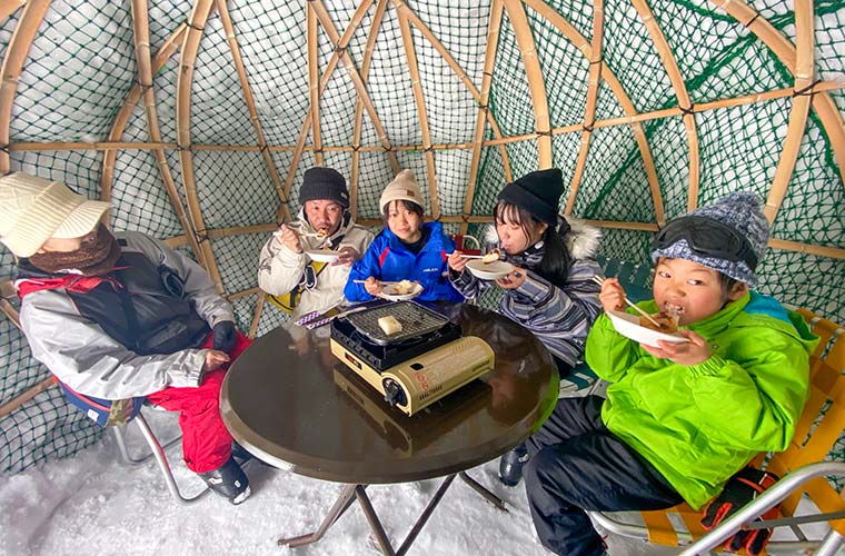 かまくらに立ち込める香ばしい香りに食欲をそそられ、コンロで暖を取りつつほっこり。そり滑りや雪合戦など、雪遊びでおなかを空かせた後ならおいしさも倍増です。