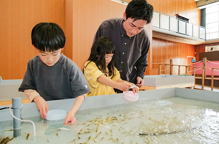 「水辺のいきものエリア」は、メダカやエビなど、水辺のいきものとふれあえるエリア。針を使わずに遊べるので、小さな子どもでも楽しむことができます。