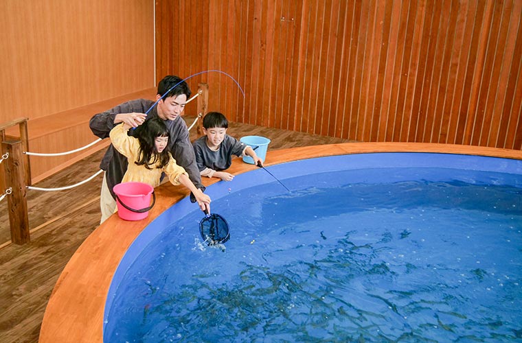 子どもと一緒に楽しめる「小型淡水魚の釣り堀」もあり、家族でチャレンジしてみるのもおすすめ。