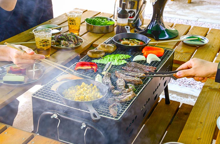 釣りの後は、手ぶらで楽しめるバーベキューエリアへ!屋根付きサイトもあるため、天候を気にせず利用できます。地元食材を使った『バッファローセット』(3,000円)が好評。お肉や野菜に加えて、釣りたての魚を一緒に焼けば、自分たちだけの特別なごちそうになること間違いなしです。