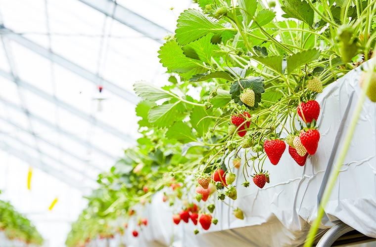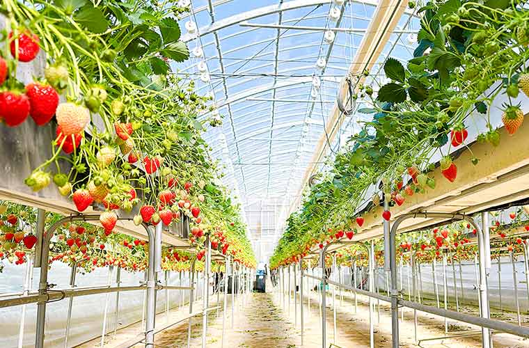 清涼な地下水を使い、二酸化炭素発生装置を使って効果的に光合成を促し、甘くておいしいイチゴを栽培しています。ハウス内をレーンで区切っていないので、自由に散策しながらいちご狩りを楽しめるのも魅力です。